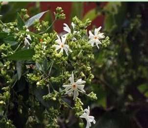 The tree is sometimes called the “tree of sorrow”, because the flowers lose their brightness during daytime; the scientific name arbor-tristis also means “sad tree”. The flowers can be used as a source of yellow dye for clothing. The flower is called Gangaseuli and some where Jharaasephali in Odisha, India. In the Borok Tipruri culture of Tripura, it is associated with the cycle of life i.e. birth and dying. It is popularly used as a garland for the dead.