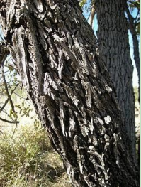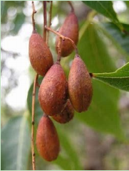 A tall, erect and nearly evergreen tree with dark grey-brown bark which becomes darker, scabby and cracked with age. Leaves are slim, glossy and long with wavy edges and extended pointed tips. Flowers are in clusters 6 long, narrow with pale-green petals. Fruit are of grape-size, present in clusters growing from a common stalk and dark purple when ripe. Flowers during late March or early April and last for a short time. Fruit ripen between late June and early August. The bark is used medicinally to allay fevers.