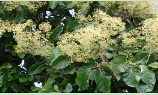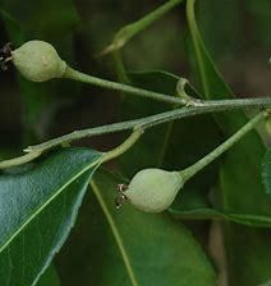 A handsome evergreen tree with long, drooping branchlets bearing dark, glossy leaves. Bark is corky, grey or yellowish with white dots. Leaves are glossy on top, narrowed at both the ends with finely toothed edges. Flowers are greenish yellow in colour, tiny in size and male and female flowers on separate trees. Flowering is in early April. Fruit are small, nearly round and dun coloured when ripe and form very quickly after the flowers but do not ripen till February or March of the following year. The leaves and fruits are used to treat the cold, fever and rheumatism.
